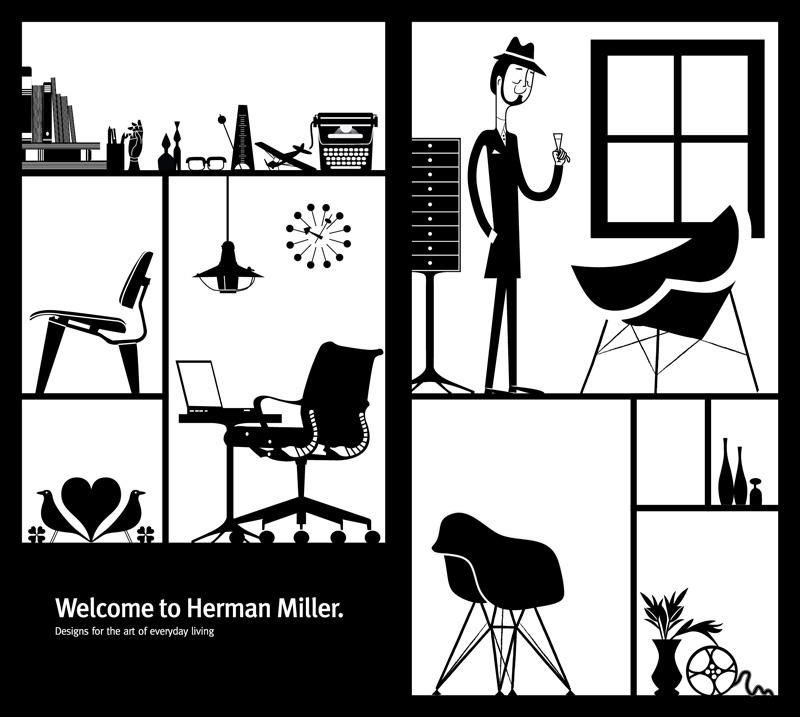 Branding graphics and designed captivating characters, including representations of Herman Miller’s founders.